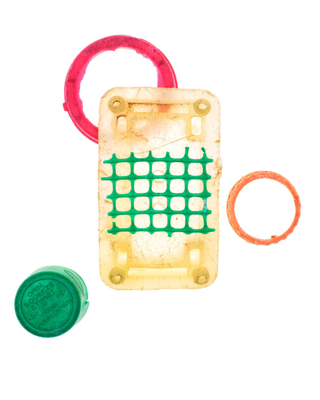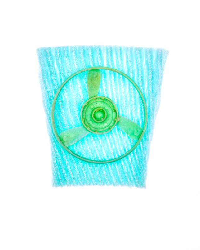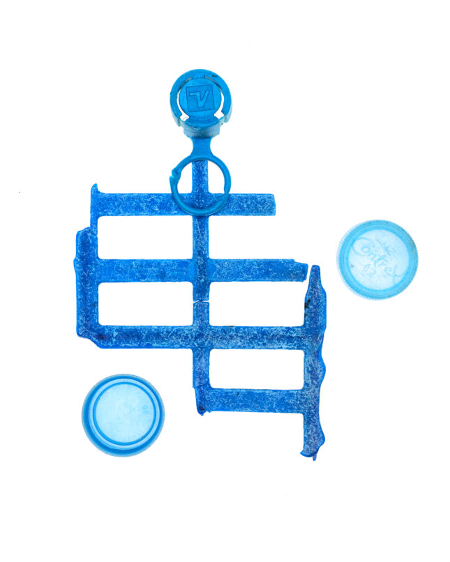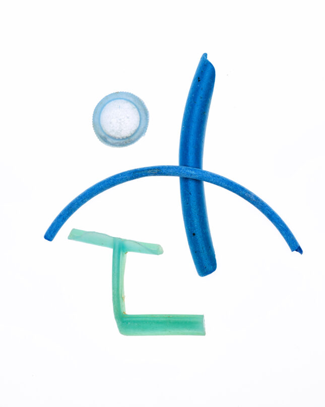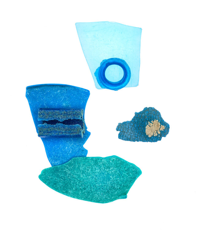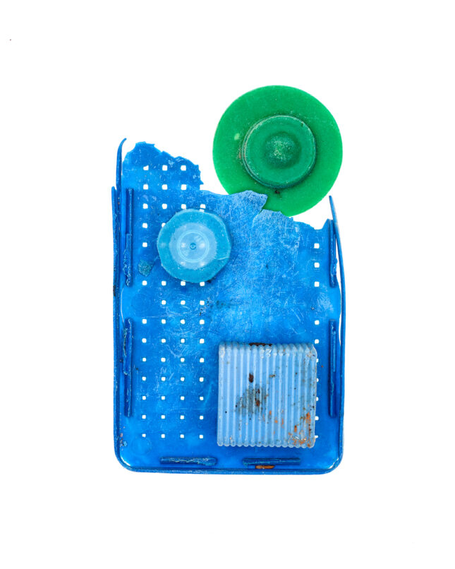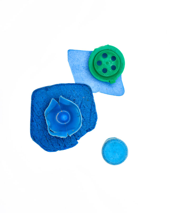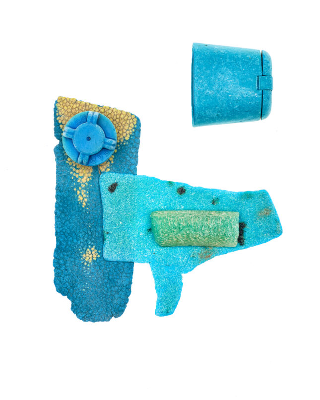 Details, Formen und Strukturen war Ausgangspunkt für dieses besondere Projekt. Gegenstände aus Plastik, die unachtsam im Meer landeten, von Wellen und Sand umspült und geschliffen, werden zu artifiziellen Objets trouvés. In changierenden Farbnuancen, in Blau- und Grüntönen des Meeres, erinnern die Fundstücke an die Gicht wogender Wellen, an flüchtige Wolkenschatten, die sich auf der Meeresoberfläche spiegeln.